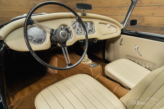 Cette Daimler SP250 respire l'élégance pure avec sa peinture noire profonde, son chrome et ses belles roues à rayons chromées. L'intérieur beige contrastant et la capote assortie lui confèrent une apparence raffinée et élégante. L'intérieur offre un parfait exemple de luxe britannique classique, avec une attention portée aux détails et au confort. Cette voiture allie beauté intemporelle et plaisir de conduire, ce qui en fait un choix parfait pour les amateurs de classiques uniques.
