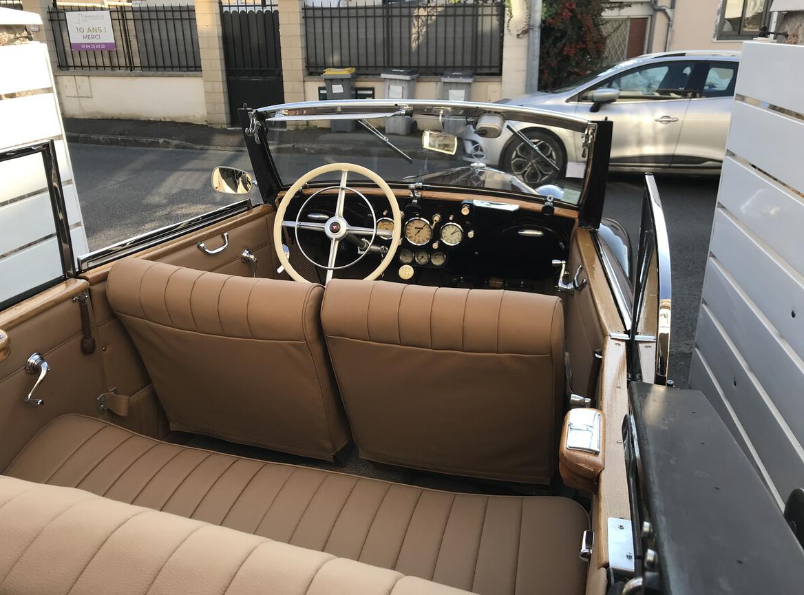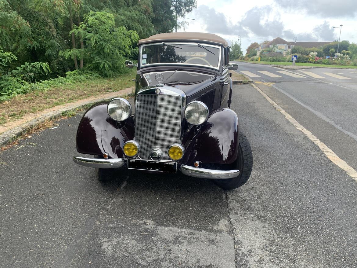 Mercedes 170VCB cabriolet 1937 restauration total carrosserie impecable sans rouilles,refection total des moteur,pont,boite de vitesse ,direction ,freins radiateur,reservoir d'essence, amortisseurs, carburateur, dynamo ,cablages electriques (12 V) avec des pieces neuves .pneus , chrome neuf ,interieur cuir refait capot aussi