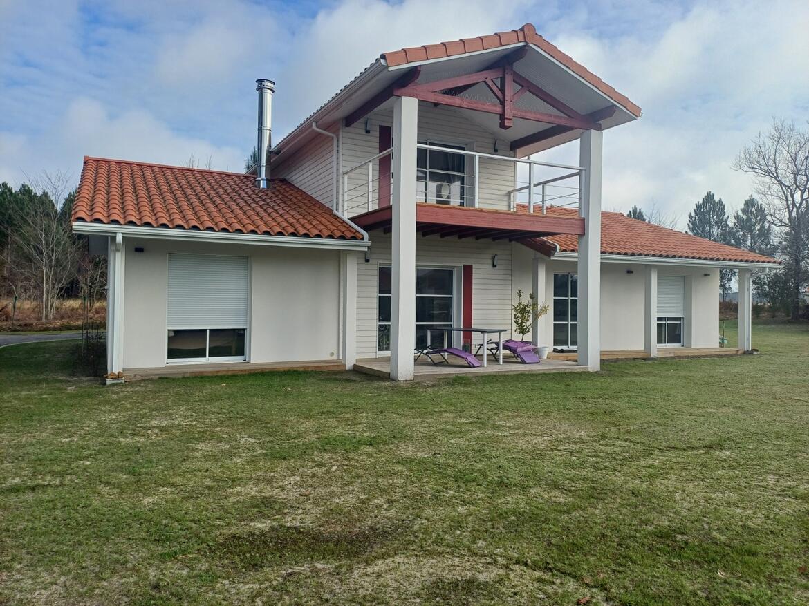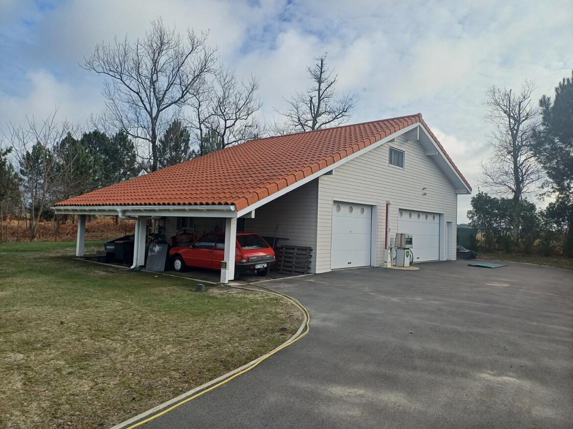 Biscarrosse / Sur terrain clos de 2.200m² limitrophe forêt, maison contemporaine 6 pièces 160m² de 2021 état neuf, classe énergie A, exposition sud, avec garage indépendant 140m² équipé (atelier, pont, sanitaires,...)